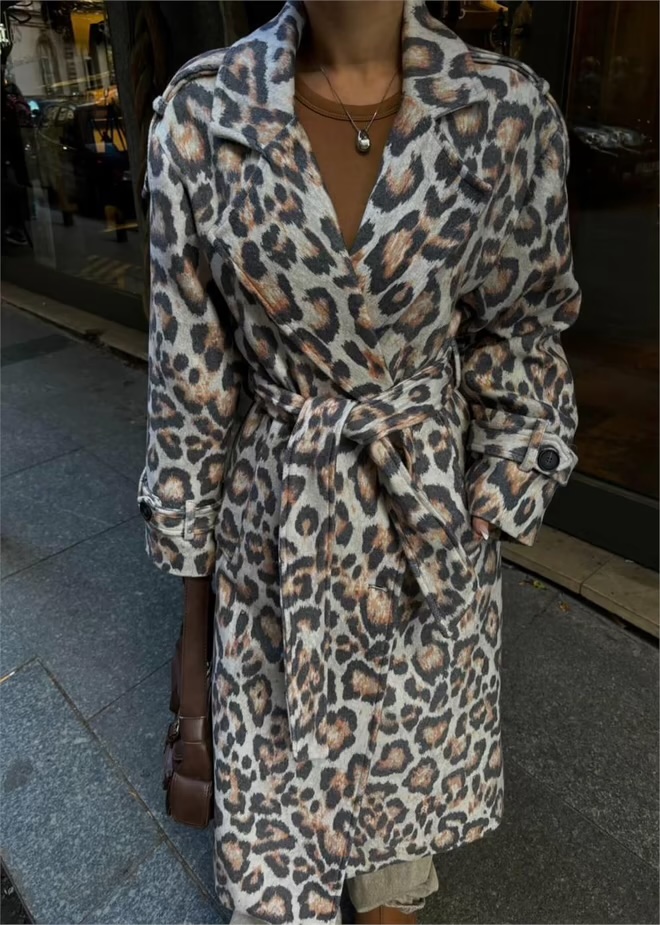 Abrigo Beige Retro Elegante Un Solo Pecho Con Estampado Animal cantidad