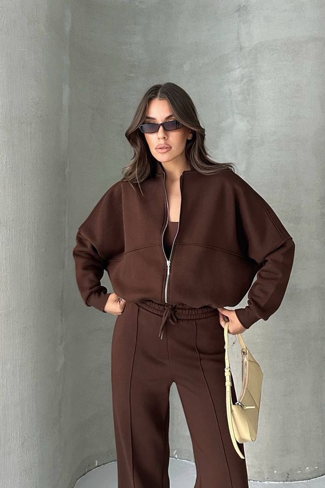 Conjunto de chándal en tono marrón chocolate. La modelo talla S